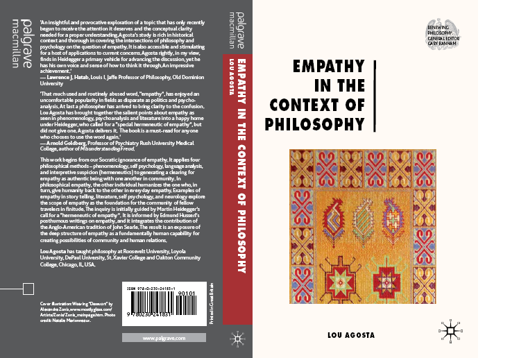Here is the cover art for Empathy in the Context of Philosopy. The picture is the top third of a weaving by Alex Zonis, my wife. The complete weaving, consisting of 250,000 teeny-tiny glass beads can be seen at www.mostlyglass.com under her name (Zonis). Check it out. My ‘friends’ are telling me ‘Well, at least there is some talent in the family!’ In order to get at the text on the back cover, you may need to see the separate post entitled Advanced Praise for Empathy in the Context of Philosophy. I am humbled by the comments of my colleagues and friends.
