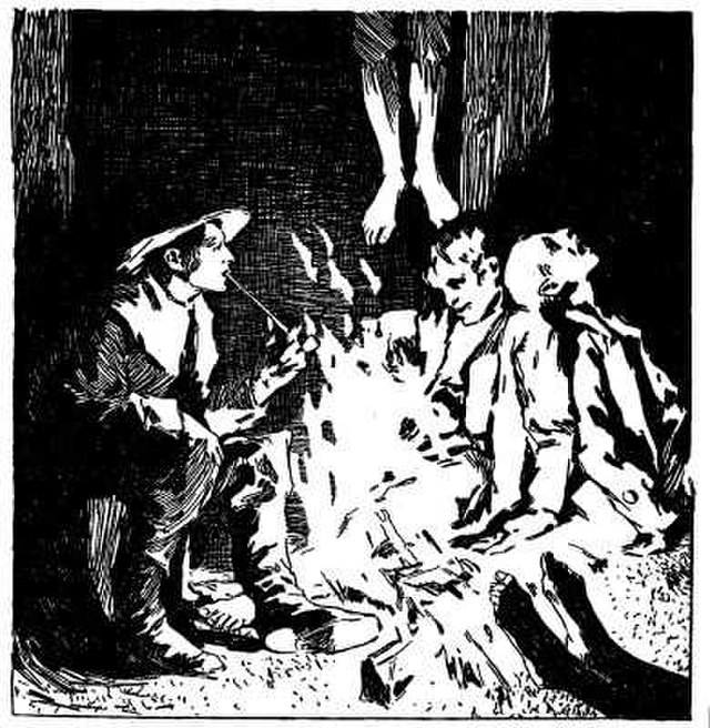 The youth is a simpleton, but one might say, no fool. He takes with him, a knife, a turning lathe with vice grip, and a fire, the three things one is likely to need in case of an emergency. The first night he is confronted by dogs and cats with red-hot chains—the beasts of hell. He uses the knife to dispatch them. The second night he is confronted by fragmentation and dismemberment. Disconnected arms, legs, and heads fall down the chimney, and the zombie-like, quasi-men propose a game of bowling. But the heads, being elliptical, do not roll well. Fearless as usual, he uses the turning lathe to make well-rounded bowling balls, and all enjoy the game.