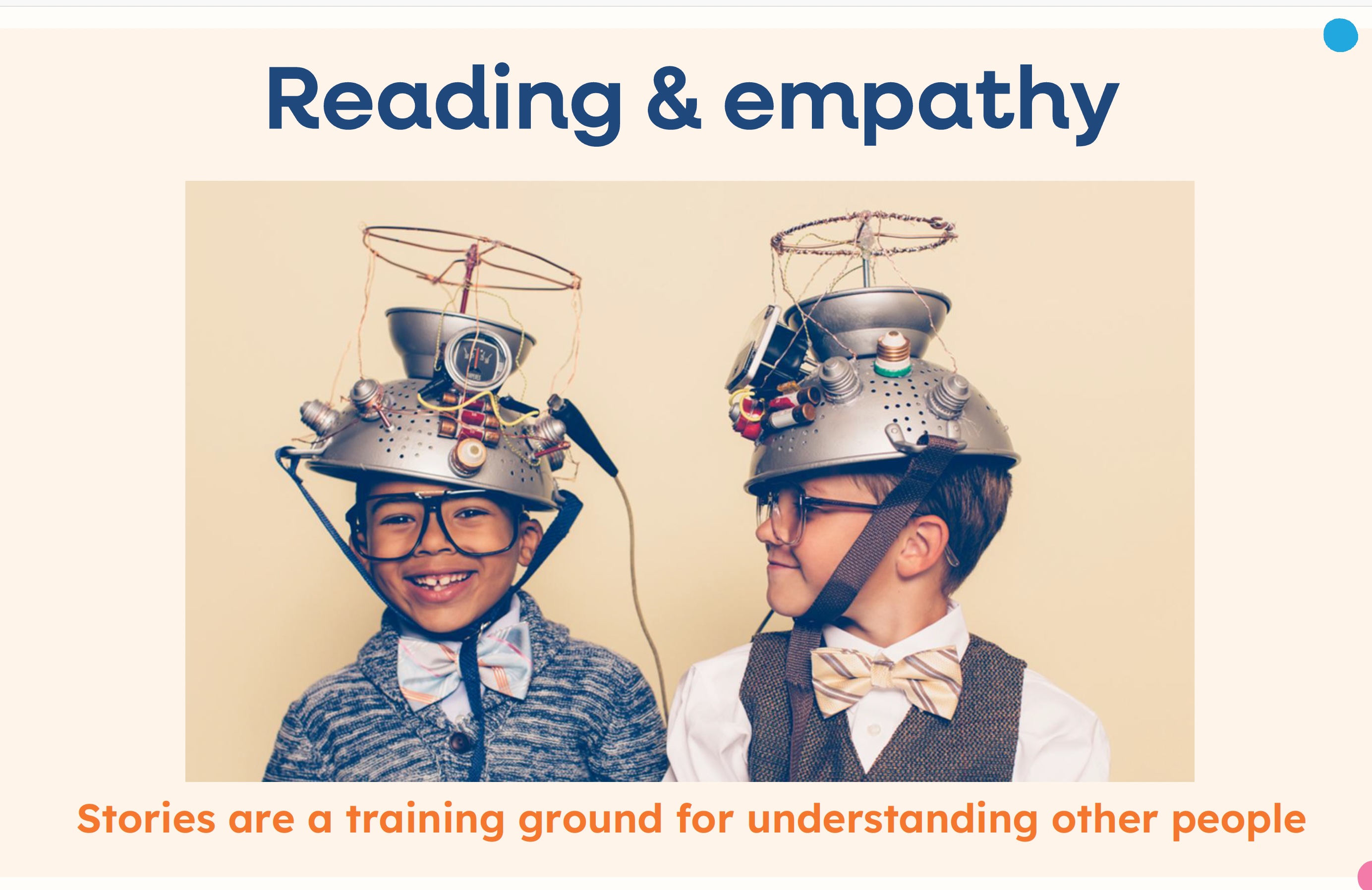 (9) Reading and empathizing: “A good book is an empathy engine”—Chris Riddell, UK Children’s Laurate. Many analogies exist between reading a text and empathizing with another person. This is not a mere analogical argument. The practices of empathy and reading are applying the same underlying micro-practices, skills, techniques, and methods. Reading literature (we are not engaging with reading legal contracts or computer documentation) is an empathic practice—not merely analogous to one, though it may be that too.